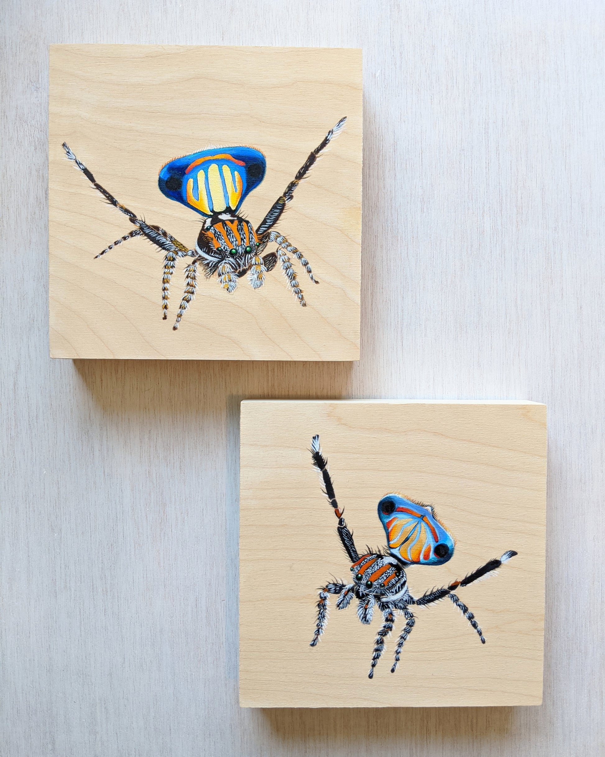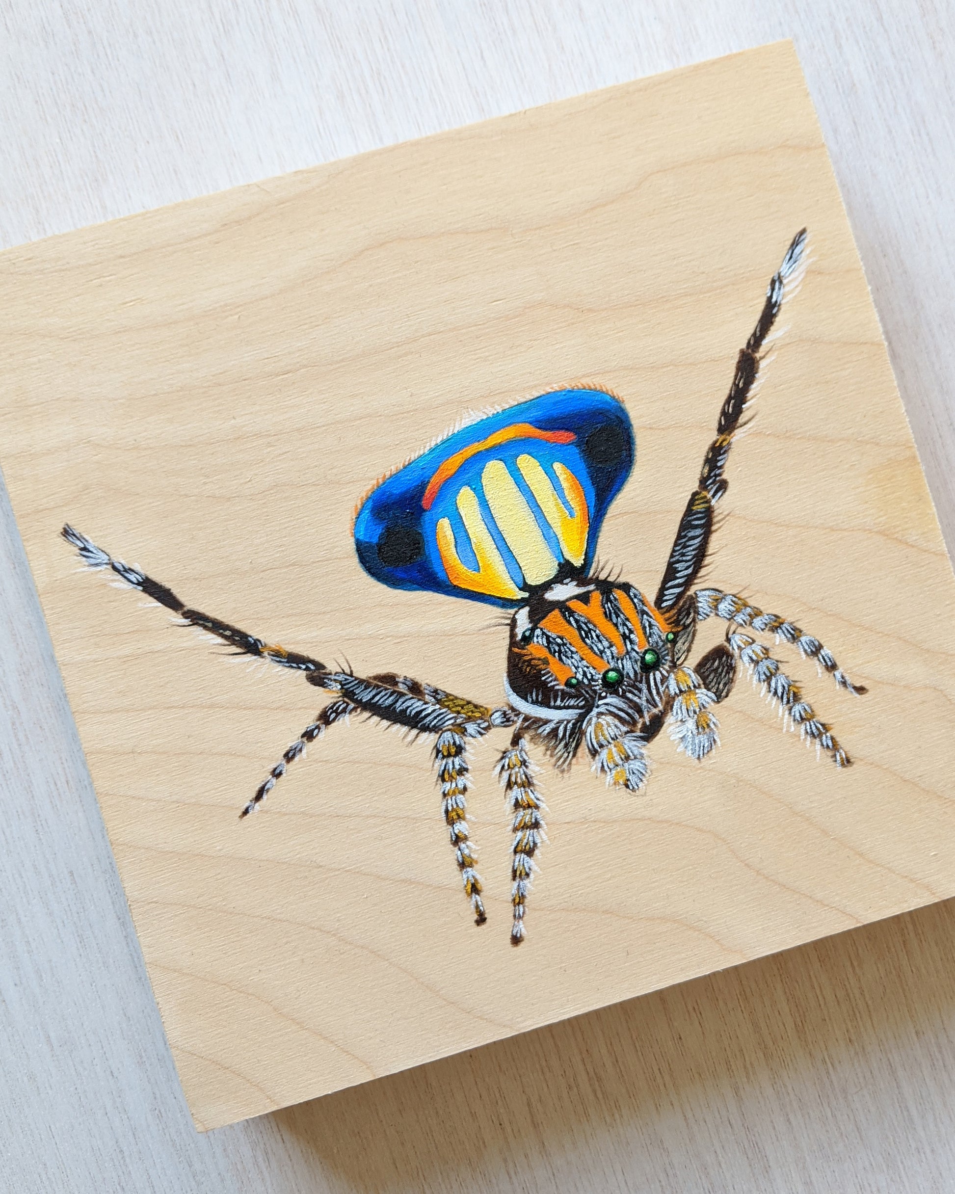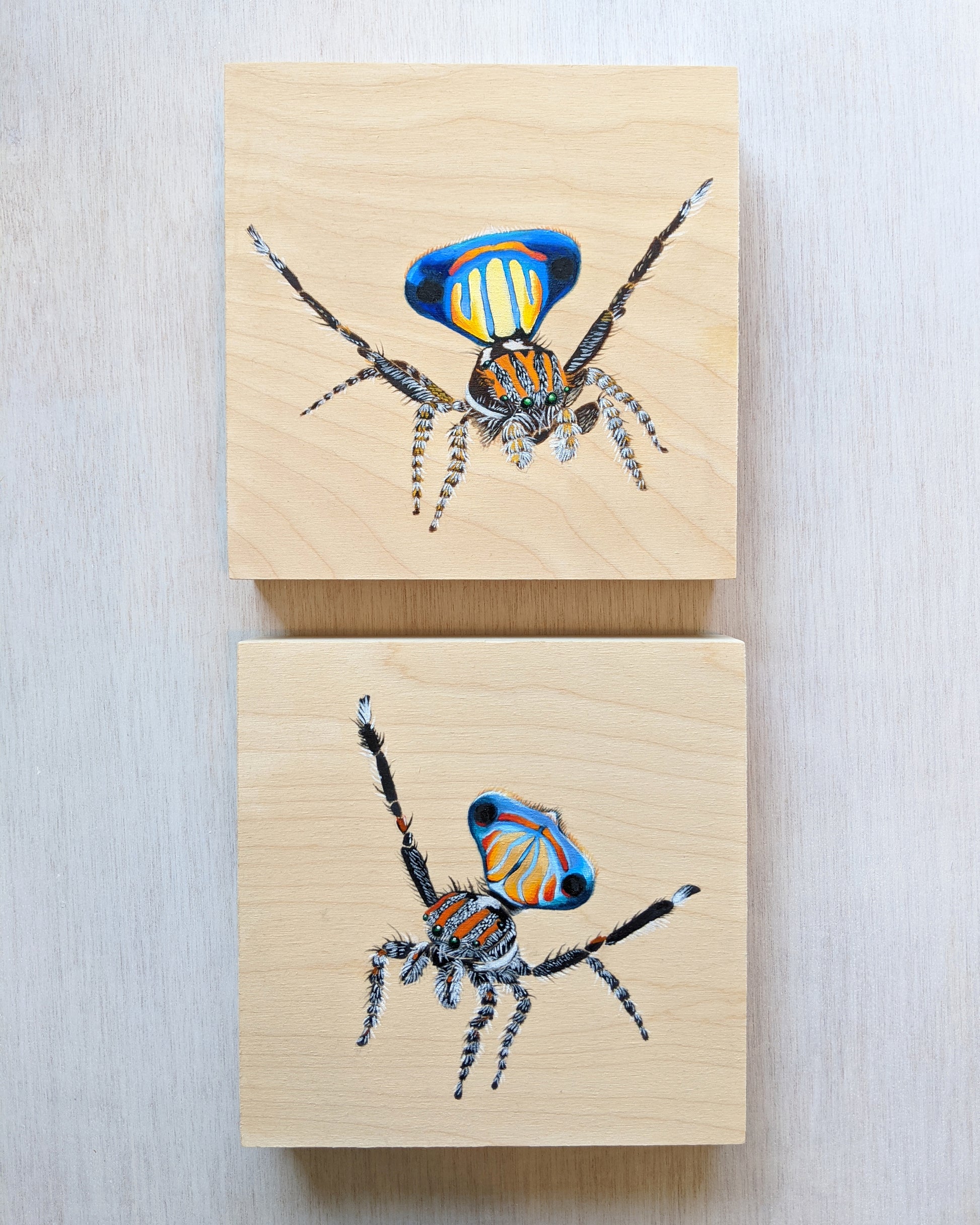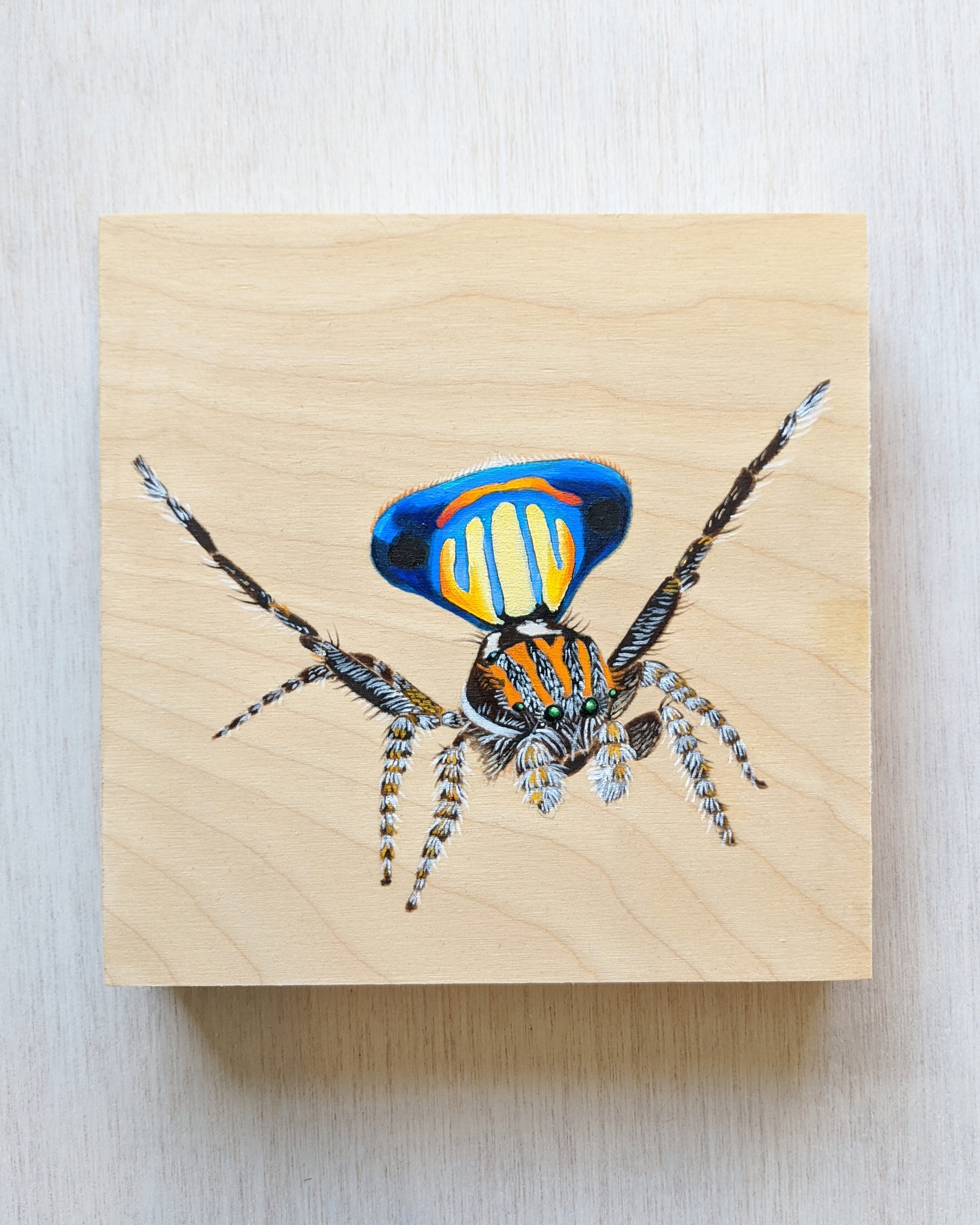 Maratus tasmanicus, a gorgeous peacock spider from Tasmania and the southeast coast of Western Australia. These teeny-tiny jumping spiders may only reach up to 5mm in size, but their beautiful colors and dance moves deserve to be seen!
