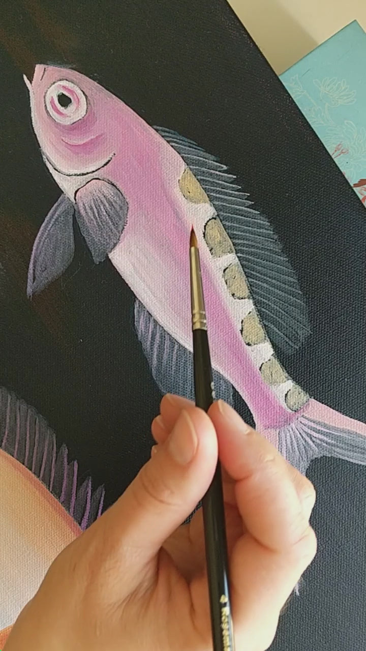 This painting features species that inhabit mesophotic or "twilight zone" reef systems in the Indo-Pacific, between roughly 100 and 500 feet deep.